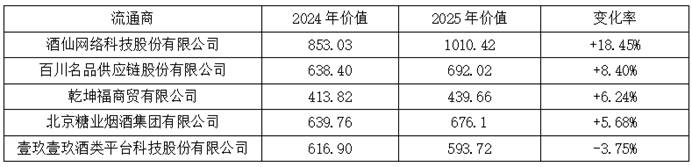 酒类流通商在本轮酒行业调整期中表现出强劲韧性,2024-2025年集中度持续提升,头部企业通过渠道整合与数字化红利(流通商年均数字化投入增长40%+)、技术赋能(AI选品和动态库存系统提高周转效率30%),进行深化变革,实现了规模扩张。前十大流通商品牌价值总和从5,177.44亿元增至5,254.41亿元,增长1.49%。